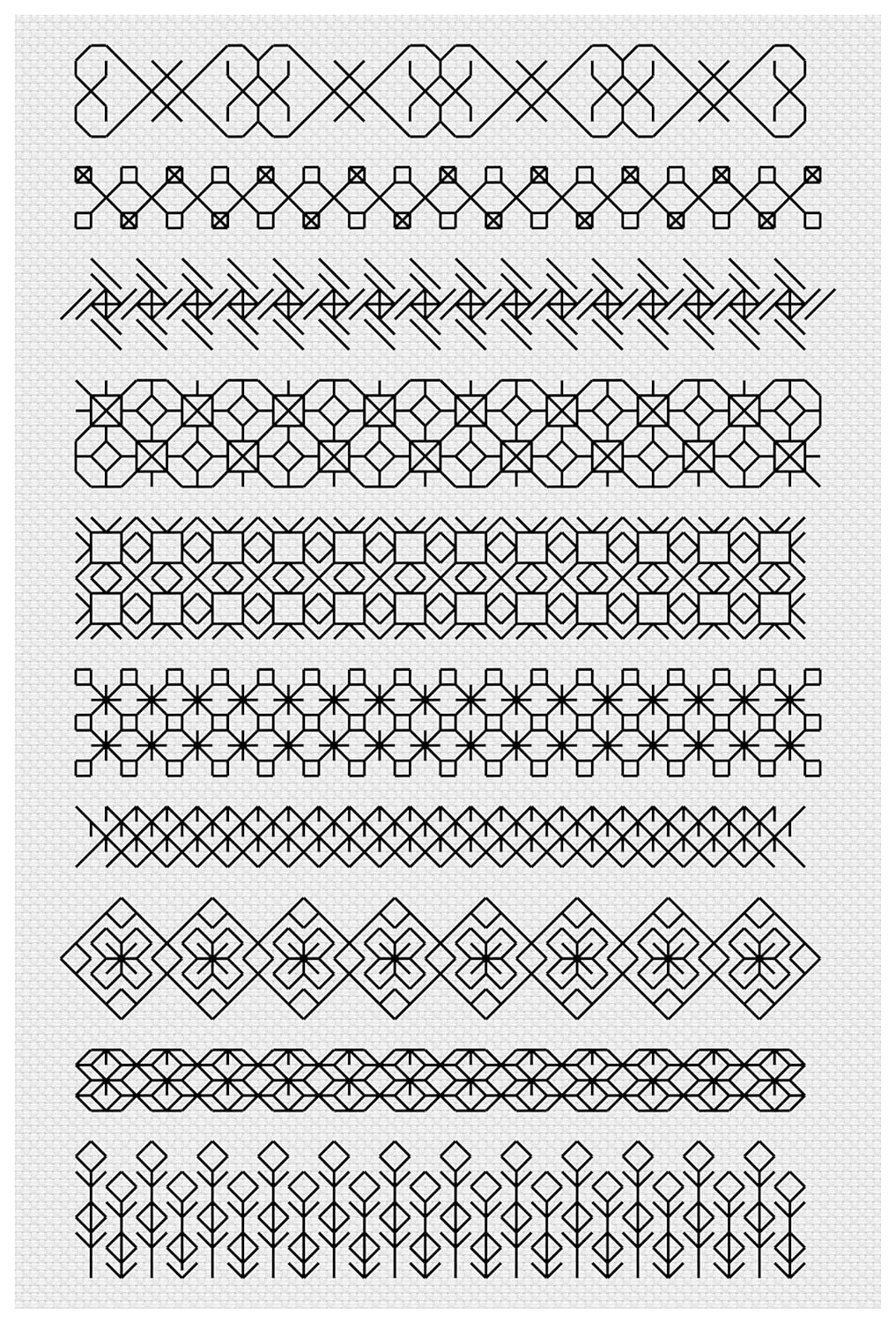 - Anyag:A blackwork általában fehér vagy világos színű vászonra vagy pamutra, selyem szálakkal, de lehet fém vagy színes szálakkal is.